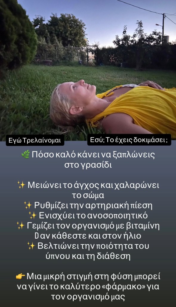 Η γνωστή δημοσιογράφος Μάγδα Τσέγκου απολαμβάνει τη γαλήνη του φυσικού περιβάλλοντος, βρίσκοντας στο πράσινο του γρασιδιού τα ευεργετικά οφέλη που προσφέρει η επαφή με τη φύση.